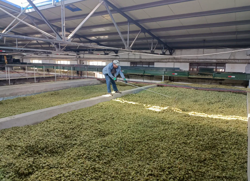 技术创新,助力产业发展。在啤酒花烘烤加工打包前端,成品花含水量不均匀,打包不成型等难题一直困扰着公司各生产单位,影响公司提质增效。经过公司不断探索,发现在打包机前端传输皮带上加装工业超声波雾化设备,可有效解决烘干酒花水分不均匀,打包不成型的问题。与此同时,公司结合生产实际在原设备基础上将管道延长至四米并均匀开孔,便于产生的雾气均匀附着于烘干成品花体上,使烘干后花体含水量进一步达标,并且具有降低花体温度、改善作业环境、防尘抑尘、提高包型质量等作用;在生产管理环节上,石硫合剂、凹凸棒粉、水杨酸等新产品新技术的推广应用,可以有效预防病虫害、改善田间土壤肥力、增加土壤有机质、提高根系活力,提升啤酒花田间综合防控管理质量,同时全力推行水肥一体化运用,科学配肥施水,提高肥水利用率,减少人工劳力成本;在啤酒花加工生产期,为有效解决燃煤锅炉生产周期短、使用点分散、司炉工不固定等生产安全的“头疼”问题,近年来公司通过不断改造探索,在原烤池燃煤锅炉基础上,新采用一台智能环保节能博士生物质热风炉作为热源动力,对比燃煤锅炉热能进行烘烤成本测算,为今后取代燃煤锅炉、规避环保安全等问题打好基础。
