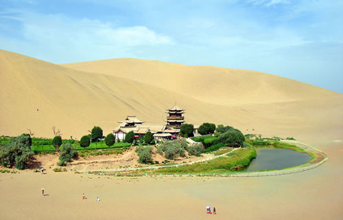 月牙泉处于鸣沙山环抱之中,其形酷似一弯新月而得名。古称沙井,又名药泉,一度讹传渥洼池,清代正名月牙泉。面积13.2亩,平均水深4.2米。水质甘冽,澄清如镜。流沙与泉水之间仅数十米。但虽遇烈风而泉不被流沙所掩没,地处戈壁而泉水不浊不涸。这种沙泉共生,泉沙共存的独特地貌,确为“天下奇观”。